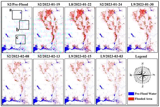 The results of flood-affected area identification, presented as a time-series using multi-sensor imagery for the study area, are shown in Figure 12. As illustrated, the changes in flood extents over time have been detected using data from various sensors. Despite the temporal resolution of Sentinel-2 imagery being 5 days and that of Landsat-8 and Landsat-9 being 16 days, the proposed method enables flood monitoring in the first three time points with a temporal resolution of 2–3 days by integrating imagery from multiple satellites. Therefore, using this approach, near real-time flood monitoring in a time-series format has been achieved. Based on the temporal resolution of each satellite and the percentage of cloud cover in the region, a temporal gap can occur in flood monitoring. This gap may result in the inability to detect flood-affected areas during specific time intervals. Therefore, the availability of more images from the region, combined with lower cloud cover, enables flood monitoring at much shorter intervals, potentially as close as 1 to 2 days. The spatial resolution of each flood map corresponds to the imagery used. In other words, the spatial resolution of the generated flood maps is 10 m for Sentinel-2 and 30 m for Landsat-8 and Landsat-9.