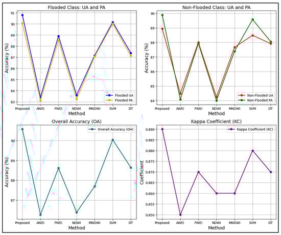 Among the alternative methods, SVM stands out as the closest competitor to the proposed method. SVM achieves nearly identical performance for flooded areas (UA: 90.16%, PA: 90.01%) and records a slightly lower OA (90.04%) and KC (0.88), suggesting it is a strong alternative but still marginally less effective. Finally, the DT method, while showing solid performance in both classes with UA and PA around 87–88%, also trails behind the proposed method in OA (88.64%) and KC (0.87).