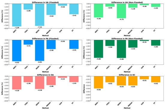 Therefore, the proposed method outperforms all aforementioned approaches, particularly in flood detection, where it demonstrates superior accuracy and consistency. While SVM serves as a competitive option, the performance of AWEI, FWEI, NDWI, and MNDWI is marked by substantial decreases in accuracy, making them less dependable for accurate flood detection. Therefore, the proposed approach offers greater reliability for NRT flood mapping. The chart in Figure 15 illustrates the accuracy assessment metrics for the proposed method (with RF) and other flood delineation methods. Also, the results of the comparison between the proposed method and other methods are presented in the charts of Figure 16.