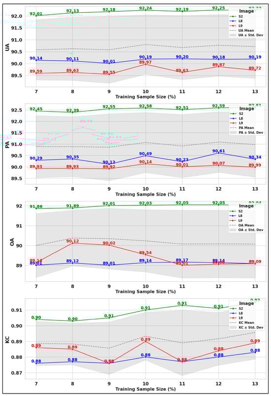 Figure 17 examines the impact of training sample size (ranging from 7% to 13%) on classification accuracy metrics, including UA, PA, OA, and KC. This analysis was conducted using satellite images from Sentinel-2, Landsat-8, and Landsat-9 to assess the sensitivity of classification performance to variations in training data proportions. The findings indicate that changes in training sample size have minimal effect on accuracy metrics. For instance, Sentinel-2 consistently achieves an overall accuracy above 92% (average 92.03%), while Landsat-8 and Landsat-9 yield average values of approximately 89.15% and 89.01%, respectively. Similarly, the UA for Sentinel-2 ranges from 92.01% to 92.25%, whereas Landsat-8 and Landsat-9 exhibit ranges of 89.55–89.87% and 90.12–90.20%, respectively. This stability highlights the robustness of classification results against variations in training sample size. A one-way ANOVA analysis revealed no statistically significant differences in accuracy metrics across different training sample sizes (p-value > 0.05). However, significant differences were observed in the classification maps produced by the three satellites. These differences appear to be driven by spatial resolution rather than sample size. Sentinel-2, with its higher spatial resolution of 10 m, consistently outperformed Landsat-8 and Landsat-9, which have a 30 m resolution, across all metrics. The low standard deviation values for all metrics (less than 0.1%) underscore the consistency and reliability of the results. Overall, the findings emphasize the advantage of higher spatial resolution imagery, such as Sentinel-2, in improving classification accuracy, irrespective of the proportion of training samples used.