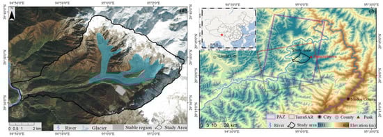 Geographical location of the study area. (a) Optical image of Zelongnong Glacier, with the Snout Located at 29.616N, 94.988E. (b) The location of Zelongnong valley and the coverage of the SAR datasets.