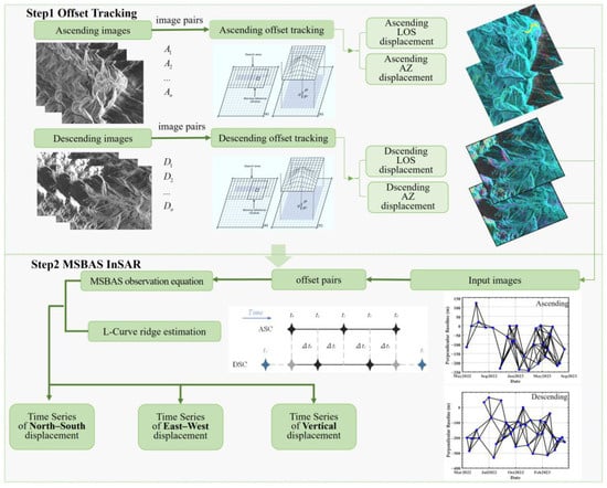 Figure 1 shows the block diagram of calculating the three-dimensional time series of glacier movement with the PO-MSBAS method. The process can be divided into two main steps: Step 1, offset tracking to obtain the LOS and azimuth movements from the ascending and descending SAR images, and Step 2, the MSBAS method for deriving the three-dimensional time series.