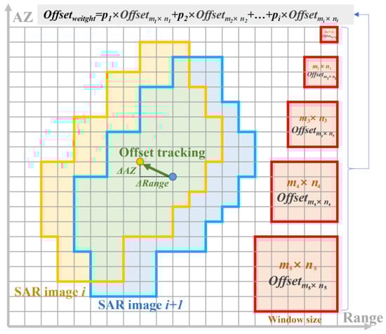 In order to improve the accuracy of offset estimation, Liu et al. proposed an improved offset tracking algorithm, which obtains a series of offset estimation sets by adjusting different image window sizes of the image block, so that each element in the estimated offset set is reordered by magnitude and the median element is taken as the final offset estimation for pixel i []. While retaining the median value improves the robustness of the method, it also results in the loss of effective information obtained from other registration window sizes. Therefore, we propose an offset tracking method based on variable window-weighted cross-correlation. After obtaining a series of offset estimation sets , the maximum cross-correlation coefficients within different window sizes are calculated. Then, the weight is determined for each window size, and the final offset can be estimated as follows: