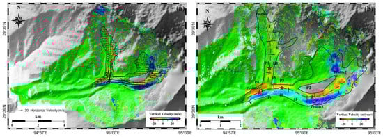 - Figure 4 reveals that the overall glacier moved to the west and south along the downslope direction. The northern tributary moved southwest or southeast. The southern tributaries, after being split into two segments by rocks in the central region, merged and continued to move westward along the main valley, undergoing some changes in direction, including to southwest, west, and northwest, and back to west again. The velocity in the southern tributary was larger than the one in the northern tributary, and it increased slightly when the two tributaries merged. The maximum horizontal velocity occurred at the first turn point of the southern tributary at over 50 m/year, whereas the maximum vertical one was over 50 m/year at the upper section of the southern tributary.