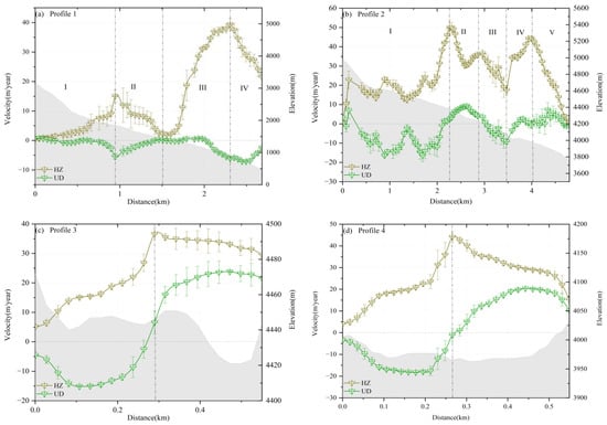 In this study, the PO-MSBAS technique was employed to derive the three-dimensional glacier motion velocities. Figure 4a shows the three-dimensional velocity map of Zelongnong Glacier from 22 June 2022 to 28 June 2023, where the horizontal velocity is shown by vectors; the vertical velocity is color-coded, with red indicating downward motion. To better analyze the spatial glacier motion characteristics, four profiles were selected along the glacier motion direction and the cross-section of the main stream in Figure 4b. The velocity profiles of the horizontal and vertical motions are plotted in Figure 5, where the error bars indicate the standard deviation calculated in the 3 × 3 pixels around the given pixel.