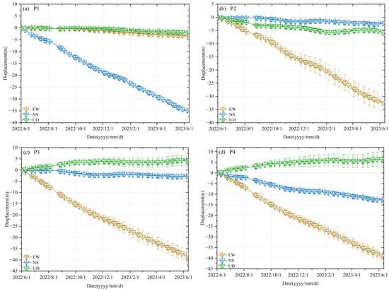 Three-dimensional displacement time series for points P1–P4, where the positions are shown in Figure 4b.