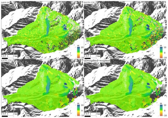 In this study, we set the minimum window size as 64 × 64 and the maximum window size as 256 × 256, with a window step size of 32 × 32 and a search step size of 5 × 5. Additionally, we set the correlation threshold to 0.2 to mask out unreliable results obtained from areas with low surface texture, shadows, and other regions.