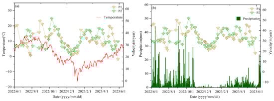 - Figure 12 reveals that temperatures remained below 0 °C from November 2022 to April 2023, and precipitation was below 5 mm from November 2022 to February of the following year. During this period, the velocity of the glacier at four points decreased significantly, which corresponds to the observed pattern in maritime glaciers, where velocity was higher in summer and lower in winter.