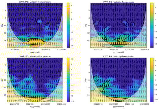 Taking P4 as an example, the arrows in the cross-wavelet energy spectrum for temperature with a 90-day periodic band predominantly point downward, while those for precipitation mainly point southwest. This indicates that glacier velocity changes lag behind both temperature and precipitation.