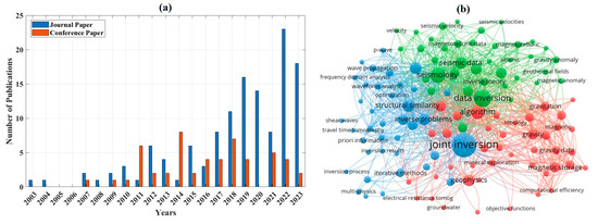 (a) Number of publications using cross-gradient joint inversion and (b) VOSviewer output of the co-occurrence of the keywords listed in Table 1 and terms relevant to cross-gradient joint inversion.