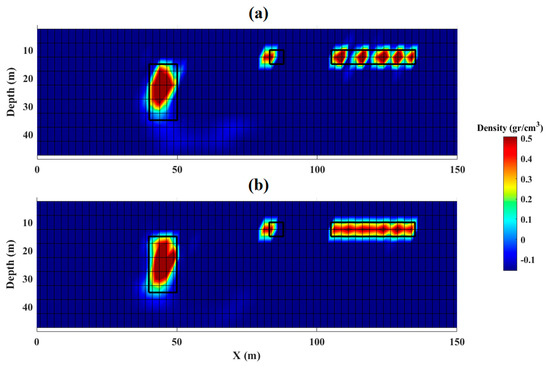 Inverse density models for synthetic Model I after simultaneous (a) separate and (b) joint inversion procedures.