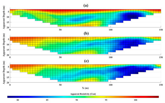Pseudo-sections of synthetic Model I. (a) The apparent resistivity data computed from the input model, (b) the computed apparent resistivities corresponding to the model obtained from the separate inversion, and (c) the computed apparent resistivities corresponding to the model obtained from the joint inversions. The RMSE percentages for separate and joint inversions are 2.85% and 3.76%, respectively.