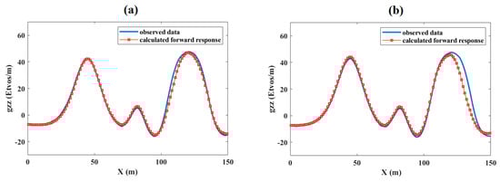 Forward modelled gzz values for synthetic Model I. (a) Values computed from the input model (observed data), along with the values corresponding to the model obtained from the separate inversion, and (b) values computed from the input model (observed data), along with the values corresponding to the model obtained from the joint inversion. The RMSE percentages are 4.1% and 4.8% for separate and joint inversions, respectively.