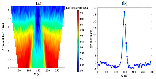 Contaminated forward responses of synthetic Model II with random noise. (a) Apparent resistivity values calculated with the Res2DMod software, and (b) calculated gravity gradient data.