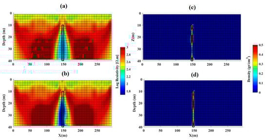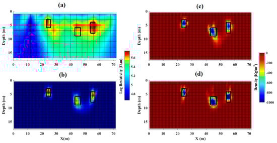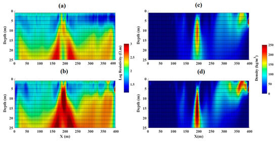 (a) Inverse resistivity model obtained from the separate inversion, (b) inverse resistivity model obtained from the joint inversion, (c) inverse density model obtained from the separate inversion, and (d) inverse density model obtained from the joint inversion.