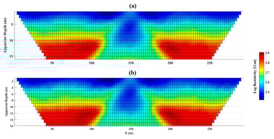 Pseudo-sections of computed apparent resistivities for the inverse models obtained from (a) separate and (b) joint inversions.
