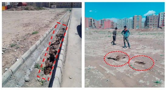 The aim of this case study is to employ geophysical techniques, including electrical resistivity and gravity gradient methods, to map the subsurface structures of a region between the two residential complexes of Maskan-e-Mehr in Kerman city (Figure 15). The Maskan-e-Mehr Project, established as a national initiative by the Iranian government, aims to address the housing needs of low-income populations by providing affordable housing solutions. Figure 16 shows some of the damage to roads and the surface resulting from the collapse of qanat outlets in the investigated site. This evidence formed part of the information considered for the estimation of the qanats’ position and depth. Understanding the current state of these qanats and their impact on the surrounding infrastructure will contribute valuable insights to urban planning, risk mitigation, and the preservation of this historical engineering legacy.