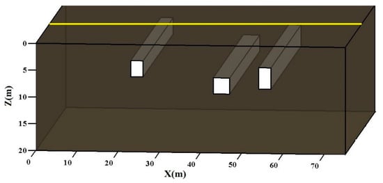 We first derived equations describing the joint inversion of resistivity and vertical gravity gradient data using the cross-gradient constraint. Next, we developed an algorithm to apply these equations to synthetic and real datasets. Synthetic 2D apparent resistivity data were generated using the Res2DMod software (K3-FAF3A051-058E), whereas the gravity gradient forward response was calculated using the formula provided in Blakely [22]. Two synthetic models were considered. The first model domain has horizontal (x) and vertical (z) dimensions of 150 m and 50 m, respectively, and was divided into square prisms with side lengths of 2.5 m, resulting in 60 prisms in the x-direction and 20 in the z-direction (Figure 2). This model consists of three bodies, each with a resistivity of 20 Ωm and a density contrast of 0.5 g/cm3 with the background. These bodies have different sizes in the vertical and horizontal directions and are set at different depths (Figure 3). The resistivity of the homogeneous background was set at 100 Ωm. The complexity of this model was deemed sufficient for assessing the performance of the joint inversion technique [23,24].