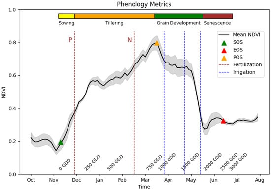 where Tmax, Tmin, and Tbase are the maximum, minimum, and base temperatures, respectively. In the case of winter wheat, the Tbase is 0 °C. By considering the cumulative temperature exposure throughout the growing season, GDDaccum provides a more accurate prediction of phenological events than calendar days alone [63]. Once the phenological metrics were calculated, the accumulation of GDD began from SOS and continued until EOS. This approach allowed temperature data to be integrated throughout the growing season, providing a normalized evolution for crop development. The GDDaccum between SOS and EOS allowed us to quantify the heat accumulation required for the progression of phenological stages, thereby providing insight into the relationship between temperature and vegetation dynamics. This GDDaccum, in conjunction with the previously derived phenological metrics, was compared with the Zadock (Z) crop development recorded in the experiment.