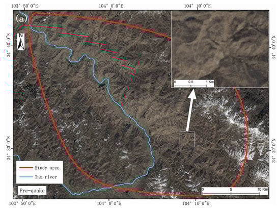 The study area is situated in the north-central section of the North–South Seismic Belt, a region highly susceptible to earthquakes due to the presence of numerous large-scale active fault zones [37]. Figure 1 provides a comparative overview of the landslide conditions in the study area before and after the seismic event. The seismogenic structure responsible for the earthquake is a branch fault on the northern side of the Lintan–Dangchang Fault Zone, which lies between the eastern Kunlun Fault Zone and the northern edge of the western Qinling Fault Zone. This fault zone features a southward thrust with a general NWW-NW strike, a NE dip, and a dip angle of 50–70°, combined with a left-lateral strike-slip component. Variations in fault zone activity characteristics contribute to post-earthquake disasters, such as landslides and collapses [20]. To enhance the accuracy of the statistical analysis of the co-seismic landslides, AI Earth was utilized to perform a comparative analysis of pre- and post-seismic remote sensing imagery. The pre-earthquake satellite imagery, dated 6 April 2013, is shown in Figure 1a, while the post-earthquake imagery, captured on 1 August 2013, is displayed in Figure 1b.