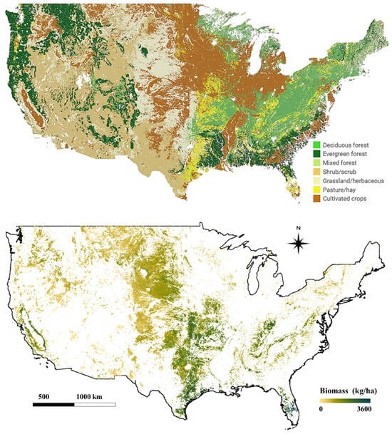 Grazing lands are essential ecosystems, covering approximately 27% of the global terrestrial surface and around 30% of the Contiguous United States (CONUS) [1]. These landscapes play a significant role in livestock feed production and maintaining regional ecological balance, while also serving as key contributors to carbon sequestration [2,3]. Effective management and precise biomass estimation are critical for sustaining their productivity and understanding their broader implications for climate change [4].