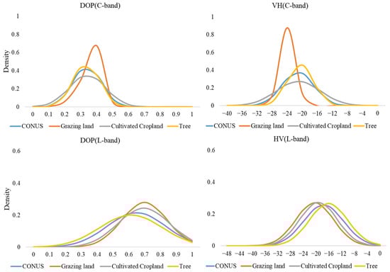 Smaller DOP values indicate more volume scattering. PALSAR (L-band) shows the largest means for grazing lands (0.700) compared to agricultural (0.695) and tree/forest regions (0.615). This suggests that depolarization due to volume scattering is less prevalent in grazing lands than in other vegetation types. The mean and standard deviation for DOP over CONUS vegetated lands is 0.649 ± 0.185. Greater values of the cross-backscattering coefficient () indicate more multiple and direct scattering from the structural elements of vegetation. PALSAR values are smaller over grazing lands (−20.495 dB) compared to cultivated cropland (−19.300 dB) and tree/forest regions (−16.180 dB). This is an appropriate value considering that the vegetation structure in forested and agricultural regions is larger and more complex, leading to relatively higher biomass than in the grazing land canopies. The mean and standard deviation for the over CONUS vegetated lands is −17.720 ± 6.210 dB.