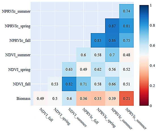 NPRVI shows a moderate positive correlation (Pearson R), ranging between 0.35 and 0.39, which was improved by normalization with constraints, compared to PRVI’s correlation of 0.33 across all seasons. In general, NDVI has a stronger positive correlation (Pearson R) with RAP estimates of herbaceous AGB across different seasons than NPRVI, as shown in Figure 3. In the summer season, both NDVI (0.60) and NPRVI (0.39) display stronger correlations with biomass compared to other seasons. NDVI during the fall and spring seasons also exhibits moderate correlations with biomass, with R values of 0.49 and 0.50, respectively. Summer shows the lowest correlation with biomass (0.21) but demonstrates a strong correlation with (0.74~0.81). These relationships highlight the varying strengths of correlation between vegetation indices and biomass across different seasonal mosaics. Overall, the optical index (NDVI) is the most sensitive to annual biomass, followed by