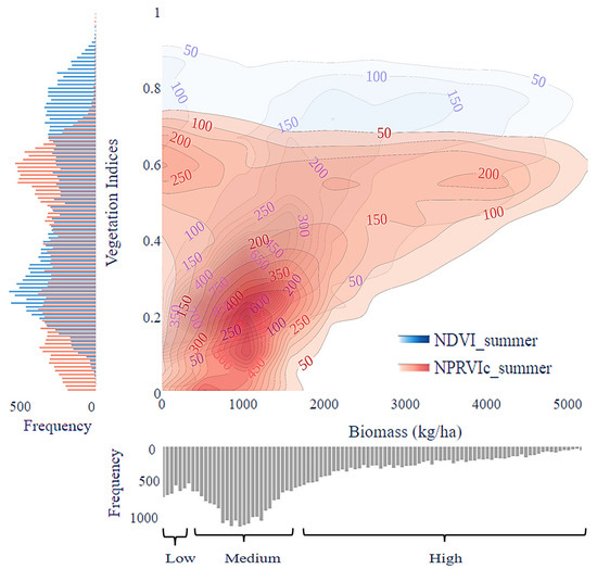 The NDVI demonstrates a robust response to biomass, with the greatest density of values observed around 1000 kg/ha (NDVI ≈ 0.275), followed by a gradual dispersion in a linear relationship. Similarly, exhibits dense clustering around 1000 kg/ha (≈ 0.15), also displaying a linear distribution pattern. Notably, ( ≈ 0.55) shows a considerable concentration of values at high biomass levels (around 3500 kg/ha), indicating that is particularly useful in high-biomass regions. Notably, both indices present exceptionally high values in regions characterized by low biomass, suggesting limitations in the reference biomass’s ability to accurately reflect local biomass conditions. The overlap in the density contours implies that both indices capture related aspects of vegetation characteristics; however, each index offers unique insights into vegetation structure, particularly in grazing lands with varying biomass levels.