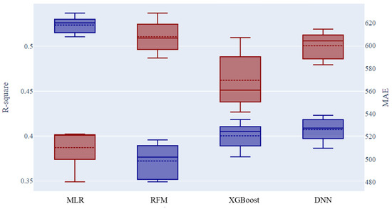 MLR is a straightforward linear approach that models the relationship between input variables and biomass. Its main advantage lies in its simplicity and high interpretability. RFM is an ensemble method that constructs multiple decision trees to enhance accuracy and reduce overfitting. However, the RFM results are more challenging to interpret, though extracting individual decision trees can offer some insights. XGBoost is a powerful gradient boosting algorithm that iteratively builds models to correct errors from previous iterations, offering high accuracy and efficiency, though it can be prone to overfitting if not carefully tuned [48]. DNNs leverage multiple layers of neurons to capture complex, nonlinear relationships in the data, providing substantial flexibility and power, but they require large datasets and computational resources and can be difficult to interpret. Each model has its strengths and weaknesses, making the comparison of models for biomass estimation necessary. For consistency, all models were trained using the same dataset.