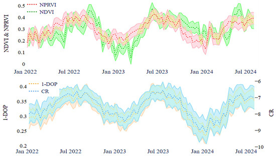 In addition, other radar parameters were also compared. The lower part of Figure 8 presents the cross-ratio (CR = VH/VV) and (1-DOP), which are less influenced by topography than the backscattering coefficient. These radar parameters, including RVI, effectively indicate the volume/multiple scattering of vegetation and show similar characteristics and variations due to changes in biomass [31,56]. The data confirm that CR and (1-DOP) have almost identical patterns, with a high correlation coefficient (around R = 0.98). While these variables provide valuable information, they are limited in their ability to indicate a wide range of biomass and are highly affected by background effects [34]. Unlike these parameters, PRVI, which led to the development of NPRVI, was developed to reduce noise by combining cross-polarization and polarimetric coherence characteristics, making it less affected by background effects and incident angles [29].