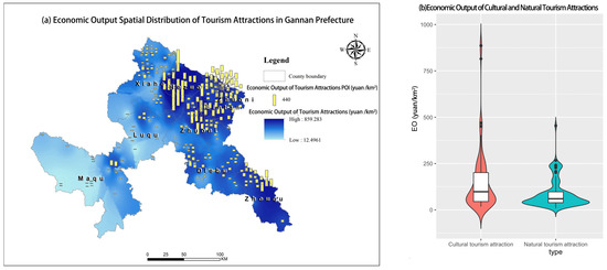 Two high-value concentration areas of economic output from tourism attractions have formed in Hezuo City in the northwest and Zhouqu County in the southwest of Gannan Prefecture (Figure 6). This also reflects the high degree of dependence of the economic development of tourism attractions in Gannan Prefecture on location and the level of regional economic development. Although Maqu has abundant tourism attractions, due to factors such as remoteness, inconvenient transportation, and excessive altitude, its economic output is very limited. The economic output of tourism attractions in Hezuo City amounts to as high as 4.66 million yuan/km2, far exceeding that of other counties and districts. The average economic output of tourism attractions in Gannan Prefecture is 1.22 million yuan /km2. Besides the attractions in Hezuo City, the economic output of the Lintan Yeliguan Scenic Area, which is closer to a million-population city, is relatively prominent. The low values of the economic output of tourism attractions mainly occur in Maqu such as Gahai Zecha and the First Curve of the Yellow River Scenic Area, which are located far from million-population cities and have poor accessibility.