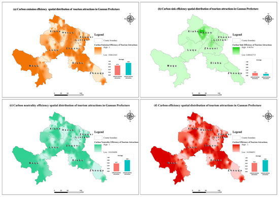 Currently, carbon emissions and economic output constitute the predominant relationships in the carbon neutralization process of tourism attractions in the current tourism development stage of Gannan Prefecture. The carbon neutrality process in natural tourism attractions is marginally superior to that in cultural tourism attractions. A scarcity of tourism attractions demonstrates high carbon sink efficiency. There remains substantial potential for enhancing carbon efficiency and carbon neutrality efficiency via carbon sinks in the future. Culture attractions, typified by temples, while natural attractions, represented by forests and lakes, all exhibit high carbon efficiency. The carbon neutralization process in Diebu County, which mainly emphasizes eco-tourism, performs better. In Gannan Prefecture, there are 163 tourism attractions with optimal carbon emission efficiency, accounting for 67.36%, and Diebu County has the highest average carbon efficiency at 0.85. Only three tourism attractions have and optimal carbon sink efficiency, namely, Qingzhen Xi Temple, Qingzhen Dasi Temple, and Erlang Temple in Hezuo City, and Hezuo City has the highest average carbon sink efficiency at 0.33. There are 154 tourism attractions with optimal carbon neutrality efficiency, accounting for 63.64%, and Maqu County has the highest average carbon neutralization efficiency at 0.84. Considering carbon emissions, carbon sinks, and economic output, there are 163 tourism attractions with carbon efficiency at the forefront of the optimum, accounting for 67.36%, and Diebu County has the highest average carbon efficiency at 0.84 (Figure 7).
