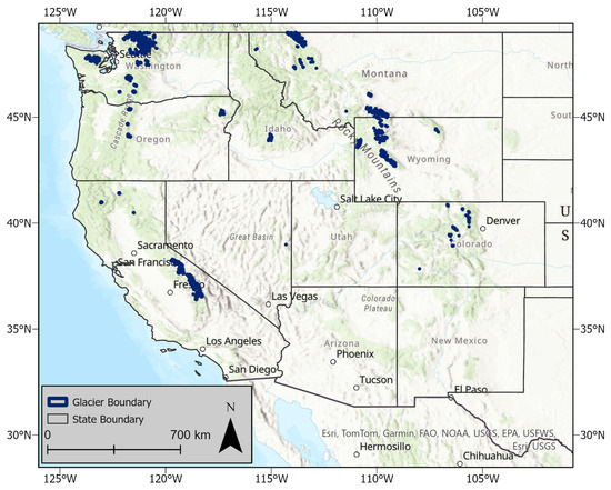 Distribution of glaciers in the western U.S. defined by RGI inventory (basemap source: ESRI Topographic map; glacier boundary source: RGI 6.0).