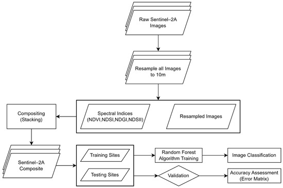 The image classification process is illustrated in Figure 2, presenting a flowchart detailing the steps involved. To ensure consistency, all bands were resampled to a 10 m resolution using the nearest neighbor method. The classification of Sentinel-2A satellite images was carried out through a machine learning supervised image classification using the Random Forest (RF) algorithm. Random Forest, a non-parametric ensemble model, employs multiple decision trees whose combined results determine the final output [38]. This approach aggregates predictions from multiple decision trees to yield a more accurate and stable result compared to other image classification methods. During the image classification, over 26,500 pixels were selected as training site pixels in each image, and each pixel was assigned a classification corresponding to water, barren land, snow, ice, vegetation, shadow, or debris [4].