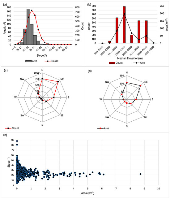 Characteristics of glacier aspect, elevation, and slope in this study. (a) Slope—area/number distribution of all glaciers and perennial snowfields. (b) Elevation—area/number distribution in 500 m bins. (c) Distribution of number of glaciers at different orientations. (d) Total glacierized area at different orientations. (e). Slope—area distribution of all glaciers. (Sources: RGI 6.0 for median elevation, slope, and aspect; the numbers of glaciers and snowfields are from this study).