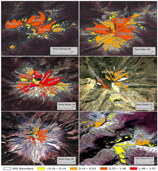Examining glacier extent changes across distinct regions in the western U.S. reveals consistent patterns of glacier area reduction. For instance, the glacier area within North Cascades National Park has decreased by 30%, aligning with prior research by [49]. Similarly, the Wind River Range in Wyoming has experienced a 31.44% reduction in glacier area, consistent with observations by [9,50], indicating a consistent trajectory of glacier area decline across different regions in the western U.S.