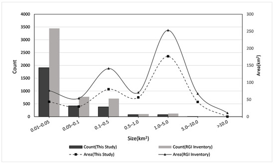 The study region is predominantly characterized by small glaciers and perennial snowfields (size < 1 km2). Out of the 2878 glaciers and perennial snowfields identified, 2792 are smaller than 1 km2, accounting for ~97% of the total number of glaciers and perennial snowfields. Despite their abundance, these small glaciers and perennial snowfields only cover 48.80% of the total area in this study, amounting to 208.95 km2. In contrast, the remaining 86 glaciers and perennial snowfields larger than 1 km2 make up 51.22% of the total area, totaling 219.4 km2. Notably, there is significant variability in glacier and perennial snowfield distribution, particularly towards smaller glaciers and perennial snowfields (<0.05 km2). While glaciers and perennial snowfields less than 0.05 km2 constitute 66% of the total number of glaciers and perennial snowfields in the study area, they represent only 10.13% of the total area covered in this study.