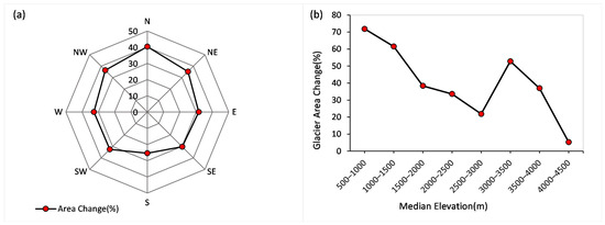 Furthermore, as depicted in Figure 6, glaciers facing north, northeast, and northwest aspects exhibit the most substantial shrinkage, with reductions of −75.4 km2 (−41.5%), −70.3 km2 (−36.4%), and −26.8 km2 (−37.6%), respectively. The accelerated shrinkage in glaciers with these aspects (N, NE, NW) could be influenced by their size, with the majority being smaller.