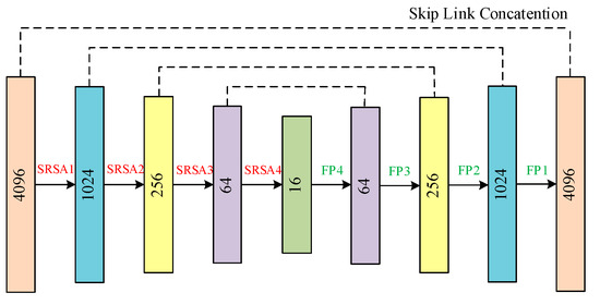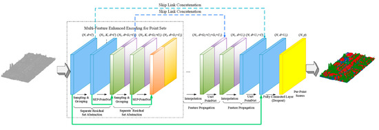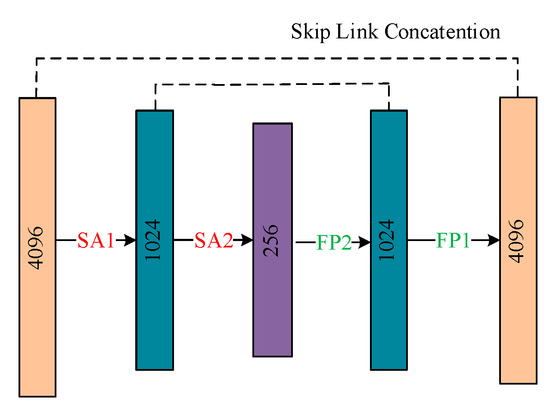 where W′l represents a 1 × 1 convolution operation. As for the deepened PointNet++, through enhanced spatial geometric encoding for one time, the extracted feature information for a sample point contains more local spatial features, while its own coordinate feature has a relatively slight weight. Therefore, it is necessary to reuse the input data to enhance the coordinate and auxiliary features of sample points. This is equivalent to applying the input of a previous SEP–PointNet layer to the current sampling and grouping operation. Similarly, in order to take further advantage of simple residual structures, the input information of point clouds is also reused and linked with the features acquired by the decoding layer in the last step of decoding, which forms another reuse structure of the original information of point clouds, as specified in Figure 1.