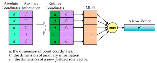 Suppose that the input of a PointNet layer is N groups of points, and each group contains K points. The dimension of point coordinates is d, and C represents the dimension of auxiliary information. As shown in Figure 2, the information dimension of each point is d + C. The encoding operation on a point set can be described as follows. Firstly, the PointNet layer processes each point in the neighborhood of a sample point and replaces all the coordinates of neighbor points with their relative coordinates to the center point, i.e., the sample point, and concatenates them together with other features of the corresponding points. Then, an MLP network is employed to conduct a convolution-like operation on each point to assemble point features. Through the MLP network, the features of all K points can be obtained, and then, a pooling operation is performed to yield a row vector of F1 dimensions. Finally, this vector is concatenated along with the coordinates of the center point of the local space. Consequently, the information of the entire local space is encoded for the sample point, and it can be approximately regarded that the sample point contains all the information of the space. For a set of points, x1, …, xn, the operation f on these points by a PointNet layer can be written as follows: