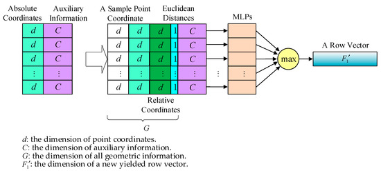 The improved encoding structure provides a specific operation for point clouds in every local space, as depicted in Figure 3. It is an enhanced PointNet layer-encoding structure, as it adds local spatial information. For the input point cloud from a local space, all the point absolute coordinates are input first into a GEO–PointNet layer network and attached with the sample point coordinate, relative coordinates of non-sample points, and their Euclidean distances to the sample point successively. Thus, the information dimension of each point is increased by 2d + 1, and the dimension of all geometric information is denoted by ‘G’. Then, the processed coordinate information of points is concatenated with the corresponding original auxiliary information. Finally, an MLP network is applied in feature aggregation. Compared with the original PointNet layer structure, each point processed by GEO–PointNet is represented not only by the absolute coordinate of its center point but also by its relative coordinates and Euclidean distance to the center point. Then, max-pooling is adopted to aggregate global and local features to yield a new row vector F’1.