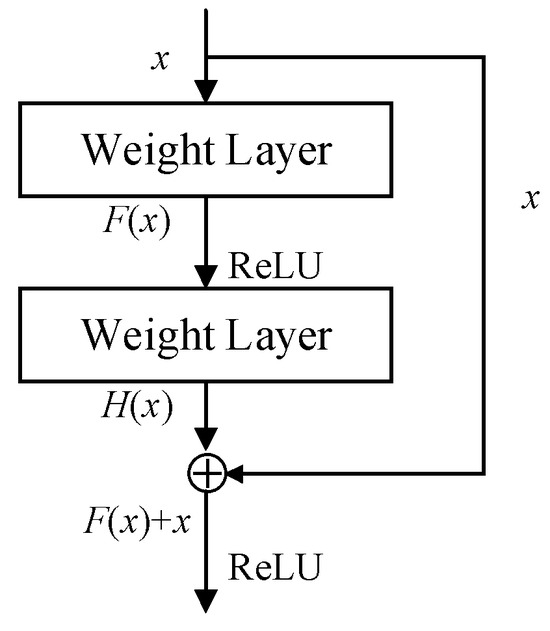 where h(xl) represents the direct mapping and is denoted by the straight line on the left of Figure 8. F(xl, Wl) is the residual part and generally contains two or three convolution operations, as drawn on the right of Figure 8.
