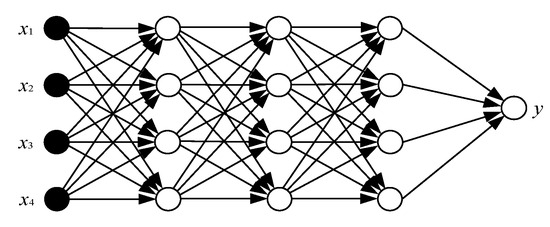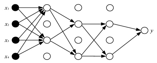However, when training a deep learning model, if there are too many parameters and too few training samples, the trained model is likely to overfit. An obvious manifestation of this is that the model presents a relatively low loss function and high prediction accuracy on training data, while in terms of testing data, its loss function is relatively large, and its prediction accuracy is low. If overfitting happens, the obtained model is useless in practice. Theoretically, it was found that the ‘Dropout’ operation can solve issues related to large models versus small samples [44] by reducing the amount of feature learning during each training, if each node is regarded as a feature detector. In general, the value of ‘Dropout’ is set to 0.5, which means that half of the nodes are hidden in each training. These nodes are commonly in hidden layers. This method can prevent the outputs of some neurons from being completely reliant on the outputs of other neurons or completely on local features. Consequently, the network will be more independent on finite samples and will exhibit better generalization performance. In general, the original neural network used for training is displayed in Figure 9 below. Figure 10 exhibits the network by adding a ‘Dropout’ operation, and the value of ‘Dropout’ is set to 0.5. It is clear that the inputs of these two networks are all x1, x2, x3, and x4, and their outputs are all y. However, the data flows in them are quite different. In the network with ‘Dropout’, some neurons are restrained randomly, according to the probability during each iteration. As a result, the forward propagation of inputs x1, x2, x3, and x4 and the backpropagation of losses will change through several layers of the network structure. Hence, after training, the parameters of all neurons are different from those of the normal version, and the dependencies among each other become non-significant.