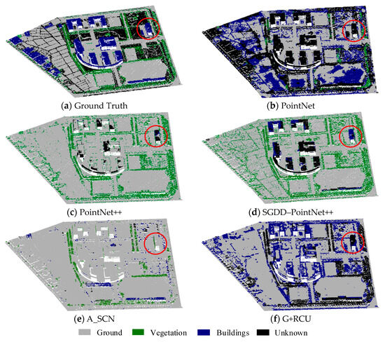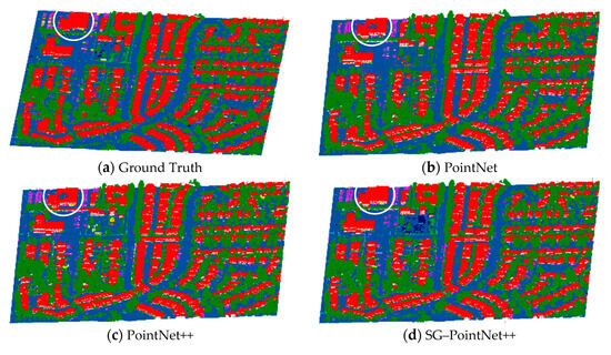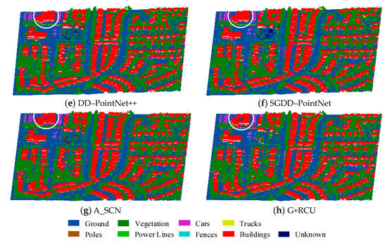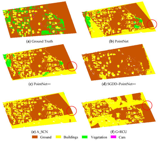 The semantic segmentation results of one typical urban scene (or tile) are visualized in Figure 12. For the convenience of a visual comparison, the segmented point clouds were rendered according to the semantic categories of the network prediction results, where each semantic category corresponds to a standard color, respectively. In the interest of conciseness, the semantic segmentation results by PointNet, PointNet++, SGDD–PointNet++, A_SCN, and G+RCU are demonstrated below.