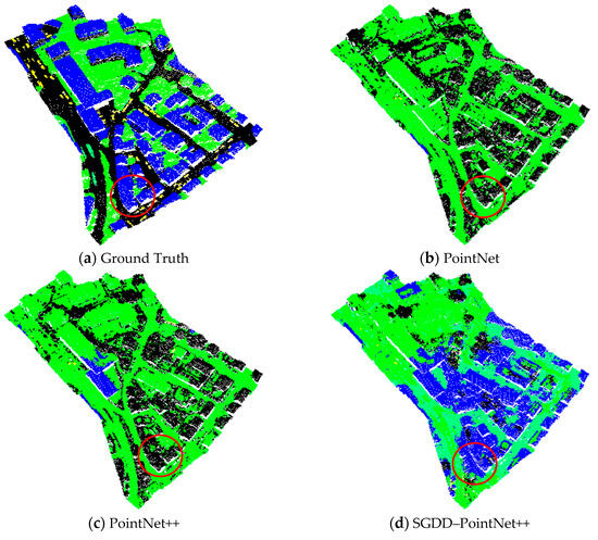 It can be concluded from Table 4 that the overall performance of SGDD–PointNet++, including its OA and mIoU, is still significantly better than those of the other networks. At the same time, as shown in Table 5, the IoUs of our network for ‘Ground’ and ‘Vegetation’ obviously improved, especially for ‘Vegetation’, with a growth of 29.35%. For ‘Ground’ and ‘Buildings’, G+RCU provided the best results. However, it could not efficiently identify ‘Vegetation’ (‘Low Vegetation’ and ‘Trees’), which belongs to a relatively small sample category of this dataset [48]. Thus, the experimental results on the LASDU dataset indicate that the proposed segmentation network is more robust to class imbalances in this small dataset. Meantime, as illustrated in Figure 13d, the segmentation result of SGDD–PointNet++ is more consistent with the ground truth, such as the contents in the red circle, which confirms the above quantitative experimental results.