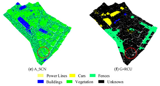 The visualization results of ‘dataset A’ of the GML airborne LiDAR dataset, obtained by different semantic segmentation networks. (a) Ground Truth; (b) PointNet; (c) PointNet++; (d) SGDD–PointNet++; (e) A_SCN; (f) G+RCU. Compared with the semantic segmentation results, the ground truth is displayed from slightly different perspectives, which can be distinguished easily. Some pseudo-segmentation boundaries are marked by red circles.