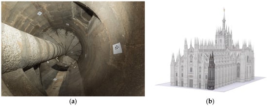 The selected case study is a complex architectural environment, the Minguzzi spiral staircase within Milan (Italy) Cathedral (Figure 1). This marble spiral staircase is situated within the right pylon of the cathedral’s main facade and spans approximately 25 m in height. It serves as a connector between three distinct levels of the building: the lower level of the roofs at its upper end, the central balcony of the facade in the middle, and the floor of the church at its base.