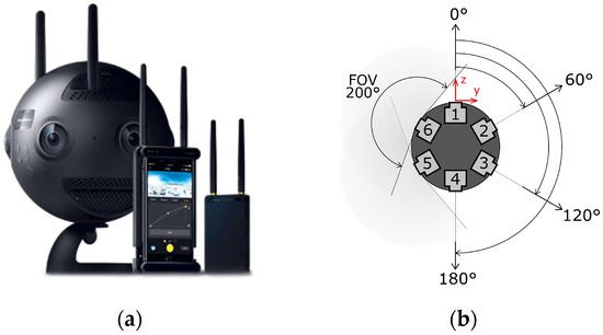 (a) The INSTA 360 Pro2 camera; (b) Schematics of the INSTA 360 Pro2 camera system.