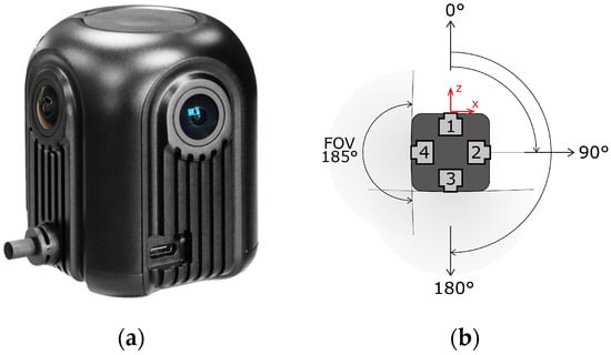 The INSTA 360 Pro2 is a professional-grade 360° camera characterized by its spherical shape, measuring 143 mm in diameter. It is equipped with six cameras, each boasting a resolution of 4000 × 3000 pixels and F2.4 fisheye lenses with a fixed focal length of 1.88 mm, providing a wide 200° field of view along the sensor’s maximum dimension. The sensors are equidistantly posed around the equator, with a relative rotation of 60°, as illustrated in Figure 2b. This arrangement makes the centers of projection of the sensors non-coincident and spaced with relative shifts, as reported in Table 1.