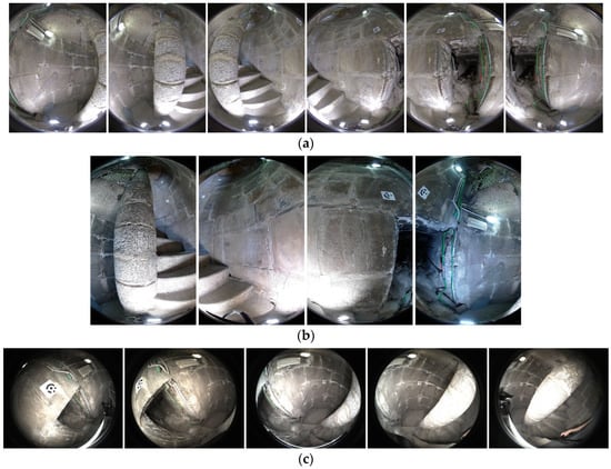 The camera simultaneously records raw fisheye images acquired by each sensor and, if enabled, equirectangular images with a resolution of 7680 × 3840 pixels achieved through real-time stitching. Stitched images can also be produced in post-processing using dedicated software such as Insta360stitcher, other open-source or commercial software such as PTGui [45] and Autopano [46], or proprietary codes for enhanced distortion correction control. However, from Table 1, it should be noted that the base length between two consecutive sensors is ca. 70 mm, increasing to ca. 120 mm between every second consecutive sensor (the sensors share a 60° FOV). Considering an average distance from the object along the spiral staircase of approximately 800 mm, the hypothesis of center of projection coincidence is far from being realistic and using stitched spherical images would imply strong image coordinate residuals.